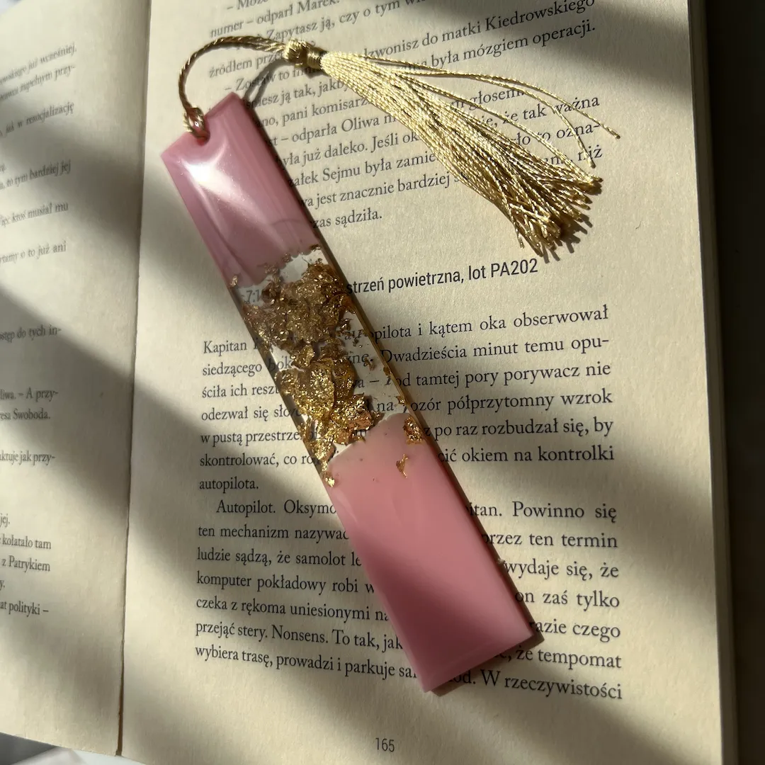 Uwielbiasz zanurzać się między stronami swoich ulubionych książek? Zakładka do książki wykonana z żywicy epoksydowej pozwoli Ci wrócić do lektury dokładnie tam, gdzie zostawiłaś/łeś swoje myśli. Wykonana własnoręcznie z dbałością o każdy detal. W pięknym kolorze pastelowego różu. Dodatek stanowią płatki w złotym kolorze. Z nią czytanie staje jeszcze bardziej przyjemne i osobiste. Chwost – lekki i subtelny w kolorze słomkowym sprawia, że zakładka prezentuje się pięknie nawet w zamkniętej książce. Wykończona topem z wysokim połyskiem. To wyjątkowe rękodzieło może stanowić piękne uzupełnienie Twojego codziennego rytuału jakim jest czytanie lub być oryginalnym prezentem dla bliskiej Ci osoby!